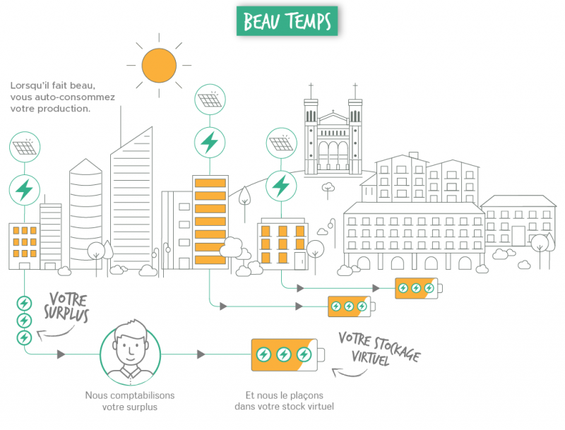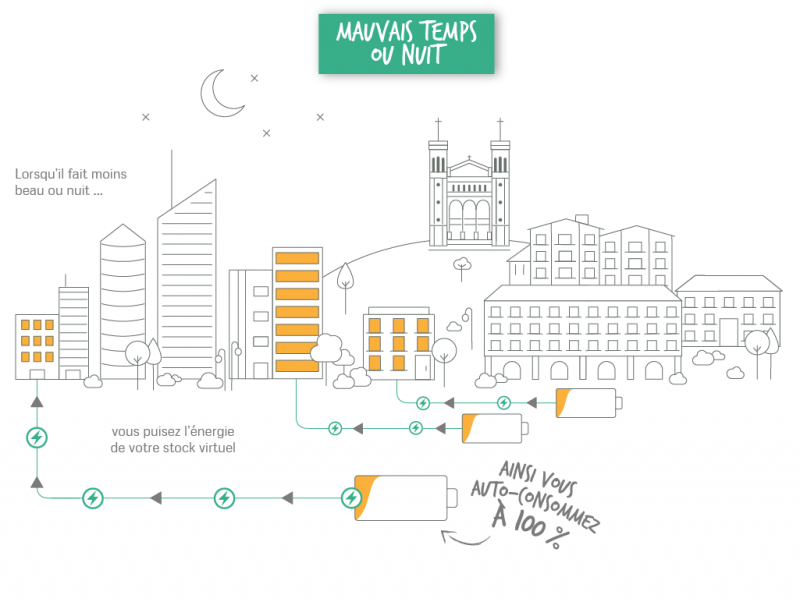 Concernant l’énergie solaire, nous savons que la nuit le soleil ne brille pas mais grâce à la batterie virtuelle vous pouvez stocker votre excédant de production pour l’utiliser la nuit ou les jours sans soleil.